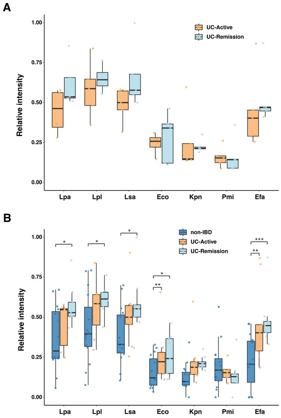 Serum IgG reactivities to selected fecal bacteria. Abbreviations: Lpa, Lactocaseibacillus paracasei; Lpl, Lactiplantibacillus plantarum; Lsa, Ligilactobacillus salivarius; Eco, Escherichia coli; Kpn, Klebsiella pneumoniae; Pmi, Proteus mirabilis; Efa, Enterococcus faecalis. (A) Comparison of serum IgG reactivity to each gut microbe by disease activity in the 5-pair cohort. For the 5-pair cohort, serum IgG reactivity is shown as boxplots for each gut microbe. Disease activities of individual patients are indicated by colors of the plots (orange: UC-Active, light blue: UC-Remission). The post hoc multiple comparisons revealed no statistically significant differences between the active and remission stages for any of the microbes (GLMM with Tukey’s post hoc test, p > 0.05 for all comparisons). (B) Comparison of serum IgG reactivity to each gut microbe across non-IBD, UC-active and UC-remission cohorts. Serum IgG reactivity from all samples is shown as boxplots for each gut microbe. Data are separated into three cohorts: non-IBD (dark blue), UC-active (orange) and UC-remission (light blue). Asterisks indicate statistically significant differences between groups following Tukey’s multiple comparison test (GLMM; *, p < 0.05; **, p < 0.01; ***, p < 0.001).