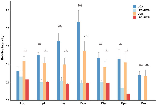 Reactivity of serum IgG to selected fecal bacteria after absorption by L. paracasei. Serum IgG from a pediatric patient with UC in the active stage and remission stage (UCA36 and UCR25, respectively) was pre-mixed with PFA-fixed L. paracasei OY7 to inhibit IgG binding to these bacteria. Reactivity of the unabsorbed (Dark blue bars: UCA, active UC; Orange bars: UCR, remission UC) and absorbed sera (Light blue bars: LPC-UCA, IgG serum from patient with active disease pre-absorbed to LPC; Red bars: LPC-UCR, IgG serum from patient in remission pre-absorbed to LPC) against protein extracts from the indicated bacterial isolates was then compared in a Western slot blot analysis. Error bars represent the standard error of the mean (SEM) from three independent experiments. Asterisks indicate a statistically significant difference between the unabsorbed and absorbed groups for each condition (two-sample t-test; *, p < 0.05; **, p < 0.01; ***, p < 0.001).