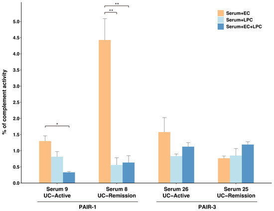 Classical complement pathway activation with immune complexes composed of serum IgG and E. coli and/or L. paracasei. The ability of paired sera samples collected from two pediatric patients with UC (PAIR-1 and PAIR-3) during active and remission stages to activate the classical complement pathway was compared after incubation with E. coli (EC; orange bars), L. paracasei (LPC; light blue bars), or both (dark blue bars). Data are expressed as the mean ± standard error of the mean (SEM) from three independent experiments. Within each serum sample, statistical comparisons among the three conditions were performed using a one-way ANOVA followed by Tukey’s post hoc test. Asterisks indicate statistically significant differences (*, p < 0.05; **, p < 0.01).