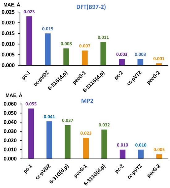 MAEs (in Å) for the equilibrium bond lengths in molecules 1–18 obtained in the optimization of their geometrical structures performed within the DFT(B97-2) (upper diagram) and MP2 (bottom diagram) levels of theory using different basis sets, evaluated against corresponding theoretical reference data. All calculated equilibrium bond lengths that were used to estimate the MAEs depicted in this Figure can be found in Tables S1 and S2 in Supplementary Materials.