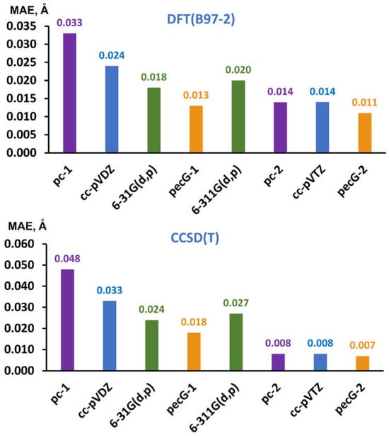 Figure 2 vividly demonstrates a superior performance of our new pecG-n (n = 1, 2) basis sets over the usual energy-optimized basis sets for both cardinal numbers within all considered levels of electronic theory. The 6-31G(d,p) basis set again demonstrates the second-best performance among the first-level basis sets, surpassing the 6-311G(d,p) basis set in the accuracy of the results for both the DFT(B97-2) and CCSD(T) methods. It is interesting to note that the values calculated within the CCSD(T)/pecG-2 scheme are characterized by the MAE of only 0.007 Å, which is very close to the average range of uncertainty of the experimental values, being 0.005 Å for the data under consideration.