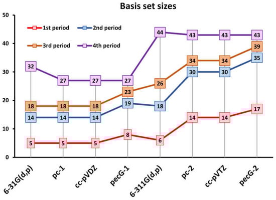Thus, in all tests, new pecG-n (n = 1, 2) basis sets demonstrated a superior accuracy over all considered standard energy-optimized basis sets. Moreover, it is worth mentioning that newly optimized pecG-n basis sets for the 4th period atoms are of the same sizes as the pc-n and cc-pVXZ basis sets for both double- and triple-zeta levels, numbering 27 and 43 basis functions, respectively. At the same time, the 6-31G(d,p) basis set is even five functions larger than the pecG-1, pc-1 and cc-pVDZ basis sets, and the 6-311G(d,p) is one function larger than the pecG-2, pc-2 and cc-pVTZ basis sets. For the sake of convenience, we have plotted the number of basis set functions for each considered basis set for atoms of 1–4 periods in Figure 3, so that one could estimate the size of the basis functional space for an arbitrary molecule.