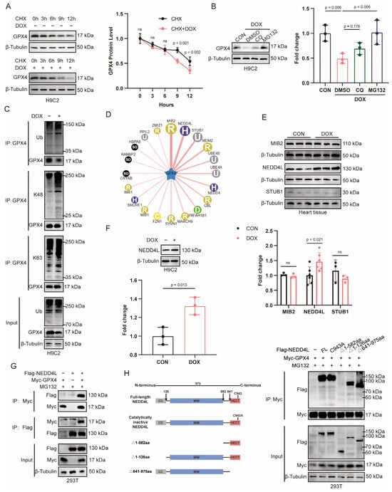 Doxorubicin (DOX) increases NEDD4L expression in cardiomyocytes, and NEDD4L interacts with GPX4. (A) Representative immunoblots and relative quantification of GPX4 in H9C2 cells treated with cycloheximide (CHX, 10 μM) at the indicated time points with or without DOX (2 μM) incubation (n = 3). ns = not significant. (B) Representative immunoblots and relative quantification of GPX4 in H9C2 cells pre-treated with MG132 (10 μM) or chloroquine (CQ, 10 μM) for 30 min prior to DOX (2 μM, 12 h) exposure. (C) Immunoprecipitation of total, K48-, and K63-linked polyubiquitination in H9C2 cells with or without DOX (2 μM, 24 h) intervention, utilizing an anti-GPX4 antibody. (D) The ubiquitin ligase of GPX4 was predicted using UbiBrowser (http://ubibrowser.ncpsb.org.cn (accessed on 20 August 2025)). (E) Immunoblots and relative quantification of MIB2, NEDD4L, and STUB1 in heart tissues from mice subjected to a single intraperitoneal injection of either saline or DOX (15 mg/kg) 7 days post-treatment (n = 3–6). (F) Representative immunoblots and relative quantification of NEDD4L in H9C2 cells following treatment with DOX (2 μM, 24 h). (G) Immunoprecipitation in HEK293T cells transfected with Flag-NEDD4L and Myc-GPX4 using anti-Flag or anti-Myc antibody, followed by immunoblot analysis with the indicated antibodies. (H) Immunoprecipitation in HEK293T cells cotransfected with Myc-GPX4 and truncated Flag-NEDD4L or catalytically inactive NEDD4L (C943A) using an anti-Myc antibody, followed by immunoblot analysis with the indicated antibodies.