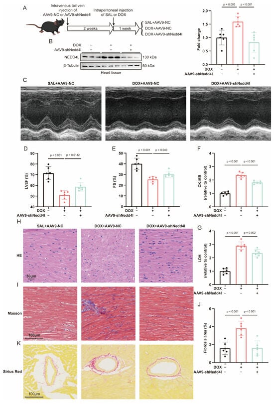 Knockdown of NEDD4L mitigates doxorubicin (DOX)-induced cardiotoxicity (DIC). (A) Schematic diagram of the animal experimental protocol. Mice were randomly divided into three groups and underwent tail vein injections of serotype 9 adeno-associated virus (AAV9) carrying either the negative control (NC) or short hairpin RNA (shRNA) targeting Nedd4l to achieve Nedd4l knockdown. Two weeks post-AAV9 injection, DOX (15 mg/kg) was administered intraperitoneally to establish a mouse model of DIC, with saline (SAL) injection serving as a control. The three groups were as follows: SAL+AAV9-NC, DOX+AAV9-NC, and DOX+AAV9-shNedd4l. (B) Representative immunoblots and relative quantification of NEDD4L in heart tissue of mice from 3 groups (n = 6). (C–E) Representative left ventricular M-mode echocardiography images (C) and echocardiographic assessment of left ventricular ejection fraction (LVEF, (D)) and fractional shortening (FS, (E)) at 7 days post-intraperitoneal SAL or DOX injection (n = 6). (F,G) Relative quantification of serum creatine kinase-myocardial band (CK-MB, (F)) and lactate dehydrogenase (LDH, (G)) levels in mice from 3 groups 7 days post-treatment with SAL or DOX, as determined using enzyme-linked immunosorbent assay (ELISA) (n = 6). (F–H) Histological images of hematoxylin and eosin (HE, (H)), Masson’s trichrome (I), and Sirius red staining (K), along with quantification of fibrosis areas ((J), n = 6), in mice from 3 groups 7 days post-treatment with SAL or DOX.