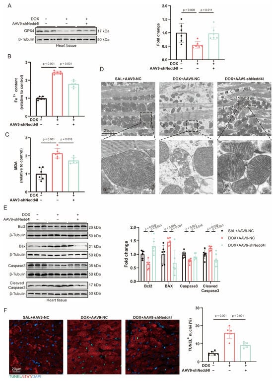 NEDD4L knockdown prevented doxorubicin (DOX)-induced ferroptosis and apoptosis in vivo. (A) Representative immunoblots and relative quantification of GPX4 in cardiac tissue from mice of SAL+AAV9-NC, DOX+AAV9-NC, and DOX+AAV9-shNedd4l groups 7 days post-treatment with saline (SAL) or DOX (15 mg/kg) (n = 6). (B,C) Relative quantification of myocardial iron content (Fe2+, (B)) and malondialdehyde (MDA, (C)) levels in mice from 3 groups (n = 6). (D) Transmission electron microscopy (TEM) images of mitochondria in heart tissue of mice from 3 groups. (E) Representative immunoblots and relative quantification of proteins related to apoptosis in heart tissues of mice from 3 groups (n = 6). (F) Representative images of terminal deoxynucleotidyl transferase-mediated dUTP nick end labeling (TUNEL) staining and quantification of TUNEL-positive nuclei in heart tissues of mice from 3 groups (n = 6).
