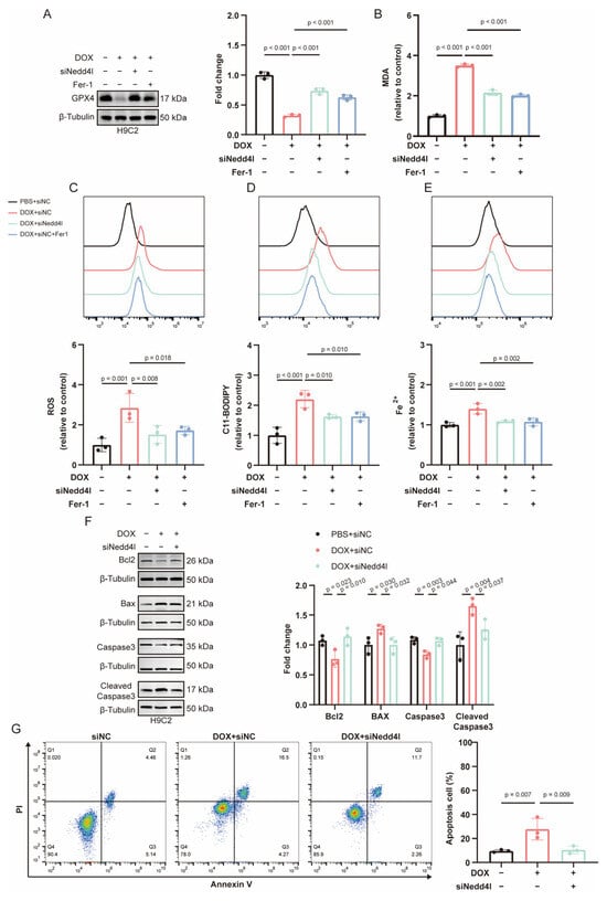 Treatment with DOX led to a significant reduction in GPX4 levels in H9C2 cells. NEDD4L knockdown effectively counteracted this alteration in GPX4 protein expression. Notably, the effect of Fer-1 on GPX4 protein levels was comparable to that observed with NEDD4L knockdown (Figure 4A). In the DOX treatment group, MDA levels were significantly increased; however, MDA levels were restored after NEDD4L knockdown or Fer-1 intervention (Figure 4B). Subsequently, we further examined other markers of ferroptosis. The DOX-induced increase in ferroptosis-related markers, including ROS, lipid ROS, and Fe2+, was attenuated by the NEDD4L knockdown or Fer-1 intervention (Figure 4C–E).