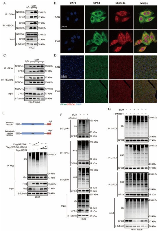 We previously demonstrated that GPX4 and NEDD4L can form a complex with each other. Through co-IP and immunofluorescence assays, we validated the interaction between NEDD4L and GPX4 and confirmed the complex formation both in vitro and in vivo. Moreover, we found that DOX can enhance this binding interaction (Figure 5A–D).