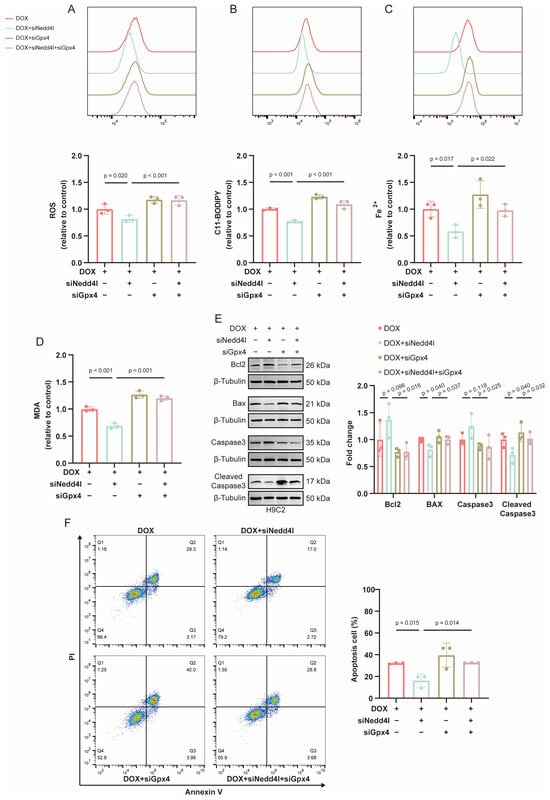 NEDD4L facilitates ferroptosis and apoptosis in cardiomyocytes by suppressing GPX4 in doxorubicin (DOX)-induced cardiotoxicity (DIC). (A–C) Histogram and relative quantification of reactive oxygen species (ROS, A), lipid peroxide (B), and ferrous iron (C) levels in H9C2 cells, detected using the staining probe of DCFH-DA, C11-BODIPY, and FerroOrange, respectively. The cells were pre-treated with either small interfering RNA targeting NEDD4L (siNedd4l) or a non-targeting control (siNC), as well as with siGpx4 or siNC, followed by treatment with DOX (2 μM, 24 h, n = 3). (D) The malondialdehyde (MDA) content of H9C2 cells with siNedd4l/siNC and siGpx4/siNC pretreatments followed by DOX intervention (n = 3). (E) Representative immunoblots and relative quantification of proteins related to apoptosis in H9C2 cells with siNedd4l/siNC and siGpx4/siNC pretreatments followed by DOX intervention (n = 3). (F) Effects of NEDD4L knockdown, GPX4 knockdown, and DOX treatment on cardiomyocyte apoptosis determined using flow cytometry analysis (n = 3).