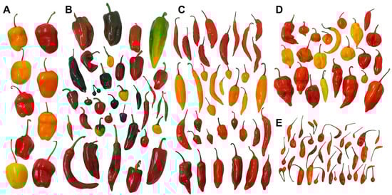 Representative fruit diversity from the Colombian Capsicum germplasm collection conserved by Agrosavia. (A) C. pubescens. (B) C. annuum. (C) C. baccatum. (D) C. chinense. (E) C. frutescens. Photographs taken from genotypes cultivated by Agrosavia in Rionegro, Antioquia.
