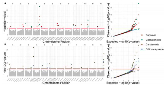 Genomic architecture of capsaicin (brown), capsaicinoids (Dark Teal), carotenoids (red), and dihydrocapsaicin (light blue). Manhattan plots (left panels) and Q–Q plots (right panels) from genome-wide association studies (GWAS) for the traits capsaicin, capsaicinoids, carotenoids, and dihydrocapsaicin (colored points). (A) Significant SNPs identified using the reference genome. (B) Significant SNPs identified using the pangenome.