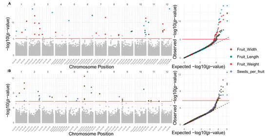 Genomic architecture of fruit morphology traits: width (brown), length (Dark Teal), fruit weight (red), and seed number per fruit (light blue). Manhattan plots (left panels) and Q–Q plots (right panels) from genome-wide association studies (GWAS) for each trait (colored points). (A) Candidate SNPs associated using the reference genome. (B) Candidate SNPs associated using the pangenome.