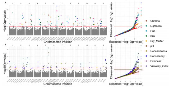 Genomic architecture of physicochemical traits: dry matter (mustard Yellow), Brix (dark green), pH (red), chroma (brown), lightness (dark Teal), hue (light blue), consistency (blue), firmness (pink), viscosity index (deep Violet), and cohesiveness (orange). Manhattan plots (left panels) and Q–Q plots (right panels) from GWAS for each trait (colored points). (A) Candidate SNPs associated using the reference genome. (B) Candidate SNPs associated using the pangenome.