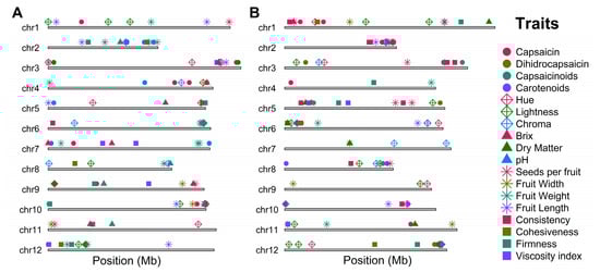 Multi-trait genomic architecture. Ideogram based on (A) the reference genome and (B) the pangenome. Shape and colors of the Traits: Capsaicin: Filled Circle-fuchsia, Dihidrocapsaicin: Filled Circle-olive green, Capsaicinoids: Filled Circle-deep green teal, Carotenoids: Filled Circle-purple; Hue: Diamon Cross- fuchsia, Lightness: Diamon Cross-olive green, Chroma: Diamon Cross-deep green teal; Brix: filled triangle-fuchsia, Dry Matter: filled triangle-olive green, pH: filled triangle-deep green teal; Seeds per fruit: Star-fuchsia, Fruit Width: Star-olive green, Fruit Weight: Star-deep green teal, Fruit Length: Star-purple; Consistency: filled square-fuchsia, Cohesiveness: filled square-olive green, Firmness: filled square-deep green teal, Viscosity index: filled square-purple.