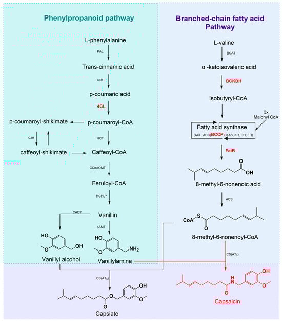 Diagram of capsaicinoid biosynthesis pathways and key genes. PAL, phenylalanine ammonia-lyase; C4H, cinnamate 4-hydroxylase; 4CL, 4-coumarate: CoA ligase; HCT, hydroxycinnamoyl transferase; CCoAOMT, caffeoyl-CoA 3-O-methyltransferase; C3H, coumarate 3-hydroxylase; HCHL, hydroxyl cinnamyl-CoA hydrase/lyase; AMT, aminotransferase; BCAT, branched chain amino acid aminotransferase; BCKDH, branched-chain α-ketoacid dehydrogenase; KAS, β-ketoacyl-ACP synthase; KR, β-ketoacyl-ACP reductase; DH, β-hidoxyacyl-ACP dehydratase; ER, enoyl-ACP reductase; ACL, acyl carrier protein; BCCP, biotin carboxyl carrier; ACC, acetyl-CoA carboxylase complex; FatB, acyl-ACP-thiesterase B; ACS, acetyl-CoA synthetase; and CS, capsaicin synthase. Adapted from [28,29].
