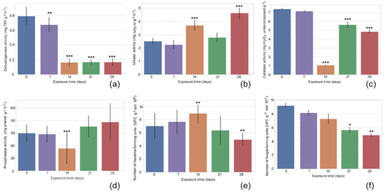 Temporal dynamics of dehydrogenase activity (a); urease activity (b); catalase activity (c); phosphatase activity (d); the number of bacteria colony-forming units (e); and the number of fungi colony-forming units (f). Data are expressed as mean values (box), with error bars indicating one standard deviation. Asterisks (*) indicate significant differences compared to the reference group (post-hoc Tukey HSD, ***—p ≤ 0.001, **—p ≤ 0.01, and *—p ≤ 0.05).
