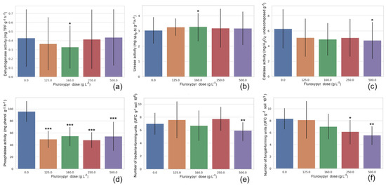 Effect of fluroxypyr dose on: dehydrogenase activity (a); urease activity (b); catalase activity (c); phosphatase activity (d); the number of bacteria colony-forming units (e); and the number of fungi colony-forming units (f). Data are expressed as mean values (box), with error bars indicating one standard deviation. Asterisks (*) indicate significant differences compared to the reference group (post-hoc Tukey HSD, ***—p ≤ 0.001, **—p ≤ 0.01, and *—p ≤ 0.05).