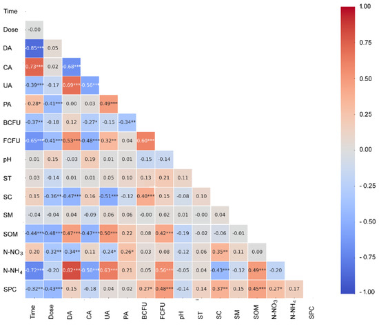 Heatmap of Pearson’s correlation coefficients between the analyzed variables. DA, dehydrogenase activity; UA, urease activity; CA, catalase activity; PA, phosphatase activity; BCFU, number of bacteria-forming units; FCFU, number of fungal-forming units; ST, soil temperature; SC, soil electrical conductivity; SM, soil moisture; SOM, soil organic matter content; N-NO3, nitrate nitrogen; N-NH4, ammonium nitrogen; SPC, soil phosphate content. Values are given as means with one standard deviation (in parentheses). Pearson correlations, ***—p ≤ 0.001, **—p ≤ 0.01, and *—p ≤ 0.05.