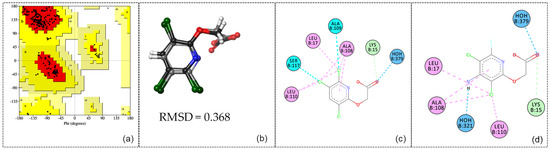 Analysis of the molecular docking procedure: Ramachandran plot (a); overlay of triclopyr (displayed in light gray) and fluroxypyr (rendered in dark gray) molecules (b); 2D molecular docking representation of triclopyr (c); and 2D molecular docking representation of fluroxypyr (d).