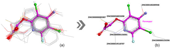 Overlay of the top compounds based on 3D similarity (TC score greater than 1.3) (a); Overlay of the six best compounds according to docking scores (b). Fluroxypyr is shown in magenta.