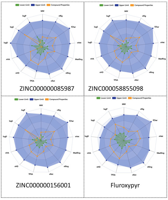 Further, a radar plot (Figure 6) was generated with ADMETlab3 based on key physicochemical properties, including lipophilicity (LogP), LogS (solubility), LogD (distribution coefficient), number of hydrogen bond acceptors (nhA), number of hydrogen bond donors (nHD), polar surface area (TPSA), rotatable bonds (nRot), ring counts (nRing, MaxRing), heteroatoms (nHet), fraction of sp3 carbons (FChar), and molecular weight (MW), revealing profiles that are comparable to those of fluroxypyr.