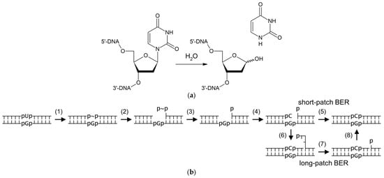 Uracil–DNA N-glycosylases (UNGs) are DNA repair enzymes that catalyze the removal of uracil, a normal RNA component, from DNA where it arises through cytosine deamination or by incorporation from the cellular metabolic dUTP pool [,,,]. UNGs are present in all cellular life forms and even in some viruses []. As a DNA glycosylase, UNGs initiate the base excision repair (BER) pathway (see [,,,] for recent reviews of BER in different organisms) by hydrolyzing the N-glycosidic bond of 2′-deoxyuridine in DNA, forming an apurinic/apyrimidinic (AP) site (Figure 1a,b). The 5′-phosphodiester bond of the AP site is then cleaved by specialized AP endonucleases, leaving a nick flanked by a 3′-hydroxyl end and a 2′-deoxyribose-5′-phosphate (dRP) remnant. The latter is removed by a dRPase (either a separate enzyme or an activity present in repair DNA polymerases), and a normal dNMP is incorporated. The remaining nick can be ligated immediately (short-patch BER; Figure 1b), or, alternatively, the polymerase can insert several nucleotides, displacing a downstream flap, which is later trimmed by a flap endonuclease to leave a ligatable nick (long-patch BER; Figure 1b).