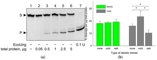 When the plants were exposed to cold stress (5 h at 4 °C) or salt stress (300 mM NaCl for 12 h), the response in the leaves and the roots was different. The relative uracil–DNA glycosylase activity did not change in the leaves after either treatment (Figure 2b). In contrast, the activity in the roots was increased by the cold stress and decreased by the salt stress (Figure 2b), although the magnitude of the effect was rather moderate (~1.5-fold change in both cases).