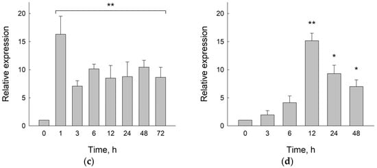 To complement the enzyme activity data, we have followed the time course of BvM14UNG mRNA levels in the whole plant upon abiotic stress. The plants were exposed to cold stress for 1 h, 3 h, 6 h, 12 h, 24 h, 48 h, or 72 h and to salt stress for 3 h, 6 h, 12 h, 24 h, or 48 h (200 mM NaCl was used in these experiments to enable longer observations without plant deterioration). During the cold stress, the expression of BvM14UNG sharply peaked at 1 h and then decreased but remained 7–10-fold higher than in the unexposed plants until the end (Figure 2c). The salt-stressed plants showed a more gradual rise followed by a decrease, with the expression of BvM14UNG peaking at 12 h and remaining ~7-fold above the unexposed control by 48 h (Figure 2d).