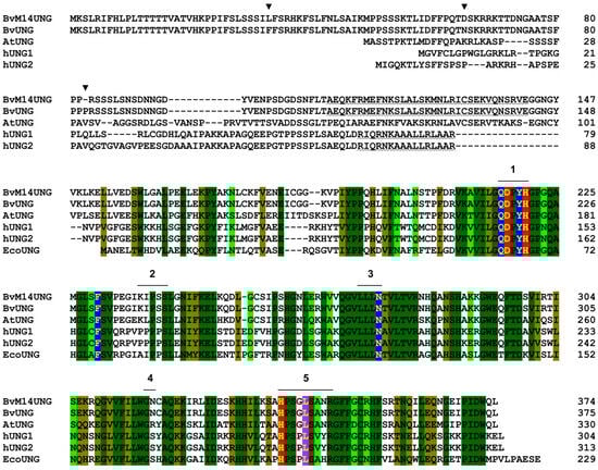 Alignment of UNGs from B. vulgaris, A. thaliana, human, and E. coli. Conservative positions across all sequences are shown in a light green (less conserved) to dark green (most conserved) gradient. Numbers indicate the water-activating loop (1), the proline-rich loop (2), the uracil recognition loop (3), the Gly-Ser loop (4), and the minor groove intercalation loop (5) as defined for hUNG in [,]. Residues forming the uracil recognition pocket are highlighted in blue, catalytic residues are in red, and helix-intruding residues are in magenta. Arrowheads mark the different positions between BvM14UNG and BvUNG. The wavy underlines show the α0 helix generated by AlphaFold (BvUNG, this work) or observed by NMR (hUNG []).