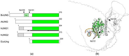For a more thorough biochemical characterization of the activity of BvUNG, we have produced the recombinant protein expressed in E. coli. Since the disordered tails present in eukaryotic proteins often cause low expression or protein aggregation in bacterial cells, we constructed plasmids carrying inserts that encode full-length BvUNG and two N-terminally truncated variants, NΔ109 and NΔ151. In BvUNG NΔ109, the protein is clipped before the start of the α0 helix, so only the disordered part is missing (Figure 4a,b). In BvUNG NΔ151, the α0 helix is also removed, and the remaining part corresponds to the extensively studied truncated form of hUNG lacking isoform-specific parts [,,,,,,,,,,,,]. Full-length BvUNG and BvUNG NΔ151 were produced as insoluble aggregates but we were able to purify soluble BvUNG NΔ109 (Figure 5a).