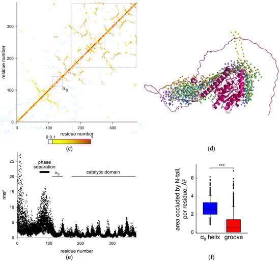 To obtain better insight into possible conformations of the disordered N-tail, we used CABS-flex 2.0, a coarse-grained Monte Carlo modeling tool [,]. For each of the five AlphaFold-generated models, we performed ten simulations, collecting a total of 50,000 structures. In the vast majority of low-energy models, the α0 helix was stable, and the N-tail folded into hairpin-like structures, compacting the occupied space (Figure 4c,d). Although the N-tail was more mobile than the catalytic domain and assumed a large range of conformations (Figure 4d,e), it was mostly located at the side of the catalytic core opposite to the DNA-binding surface of UNGs, leaving the protein–DNA interface minimally perturbed (Figure 4f). We also analyzed the BvUNG structure using ParSe v2, a neural network trained on an extensive set of intrinsically disordered proteins [], to assess the propensity of the N-tail to induce liquid–liquid phase separation. Indeed, residues 73–99 were predicted by all ParSe classifiers as intrinsically disordered and prone to undergo phase separation (Figure 4e).