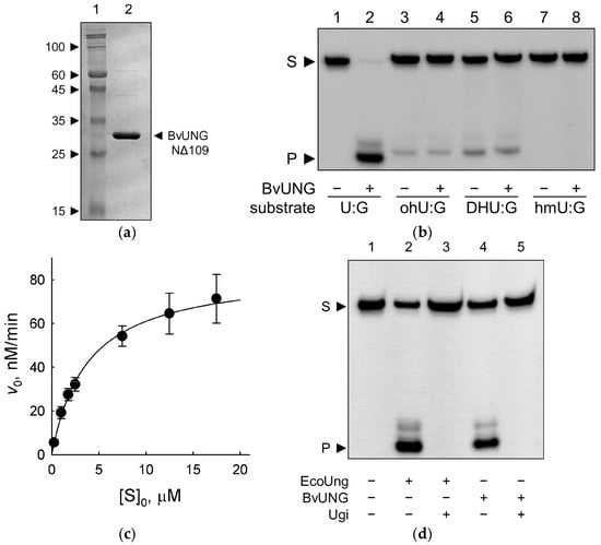 Activity of the recombinant BvUNG. (a) Purified BvUNG NΔ109 after 12% SDS-PAGE. The gel was stained with Coomassie Blue. Arrows show the molecular weights of the mobility markers. The expected molecular weight of BvUNG NΔ109 with a His-tag is 32 kDa. (b) Activity of BvUNG on DNA duplexes containing various damaged pyrimidine bases. (c) Representative plot of reaction velocity vs. substrate concentration for cleavage of the U:G substrate by BvUNG. (d) Inhibition of BvUNG by Ugi. S, substrate; P, cleavage product.