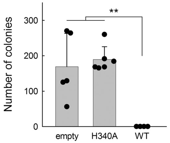 Survival of E. coli CJ236 transformed with the empty pET-15b plasmid or pET-15b carrying wild-type or H340A BvUNG insert. Mean ± s.d. (n = 4–6); **, p < 0.01 (one-way ANOVA with Holm–Bonferroni correction).