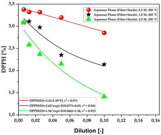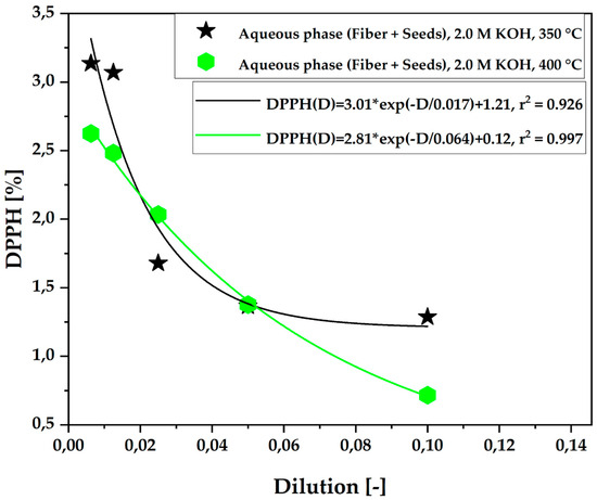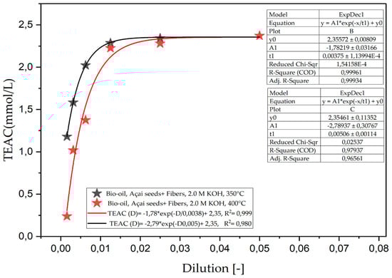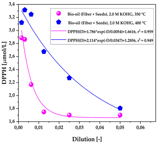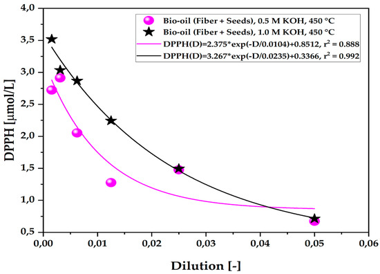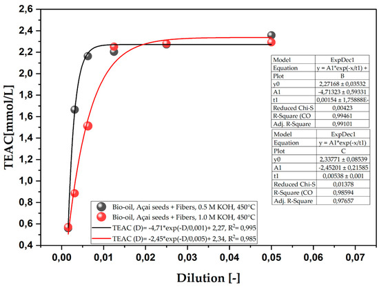 The antioxidant capacities of bio-oils obtained by the pyrolysis of açaí seeds (E. oleracea) using different concentrations of KOH (0.5 and 1.0 M) at a temperature of 450 °C and atmospheric pressure, under laboratory conditions, are shown in Figure 3. A regression analysis shows that both models present an excellent fit (R2 of 0.995 for 0.5 M and 0.985 for 1.0 M), demonstrating that the relationship between dilution and antioxidant capacity follows a first-order decay behavior.