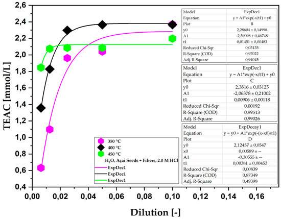Figure 2 shows the total antioxidant capacity (TEAC) of the aqueous phase obtained from the pyrolysis of açaí seeds + fibers, chemically activated with 2.0 M HCl solutions at temperatures of 350, 400, and 450 °C on a laboratory scale. The experiments show that the total antioxidant capacity, measured by the TEAC method, decreases as the dilution increases, following a first-order exponential decay pattern. It was also observed that, from a dilution of 1:40, the total antioxidant capacity in Trolox equivalents decreased considerably, indicating that, for this dilution ratio, the antioxidant capacity remained practically constant.