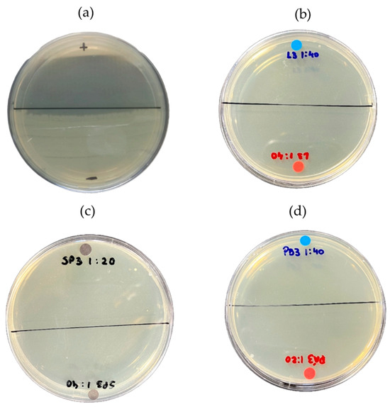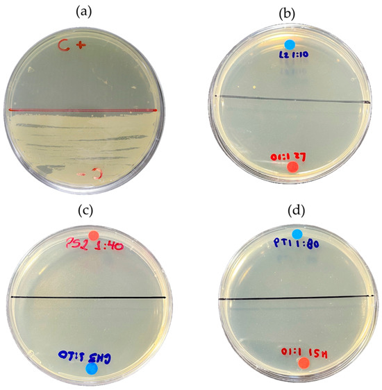 Minimum bactericidal concentration (MBC): (a) positive control (E. coli) and negative control (chloramphenicol 5 mg/mL); (b) MBC corresponding to wash water; (c) aqueous fraction; and (d) organic fraction against E. coli strain.