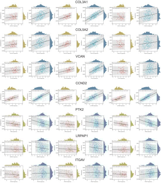 VTN showed consistent positive correlations with all three scores in both primary and metastatic tumors, suggesting their involvement in enhancing stromal support and recruiting immune cells. These genes were particularly linked to stromal components and the overall ESTIMATE score, indicating a strong association with the tumor stroma and its role in promoting tumor progression. Interestingly, some gene-TME interactions varied between primary and metastatic samples, especially regarding stromal and immune scores. In contrast,