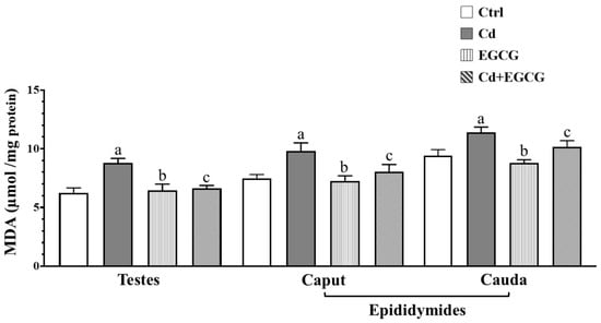 2.3. Effects of Cd, EGCG, and Cd+EGCG on Lipoperoxidation