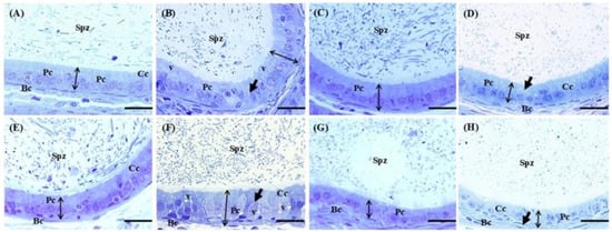 2.6. Effects of Cd, EGCG, and Cd+EGCG on Epididymal Epithelium