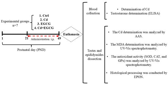 Pérez-Aguirre, S.G.; Vigueras-Villaseñor, R.M.; Bonilla-Jaime, H.; Montes, S.; Galván-Arzate, S.; Hernández-Rodríguez, J.; Marín de Jesús, S.; Carrizales-Yañez, L.; Rojas-Castañeda, J.C.; Arteaga-Silva, M. Epigallocatechin-3-Gallate Enhances Antioxidant Activity and Improves Testicular and Epididymal Histology in Cadmium-Exposed Prepubertal Rats. Int. J. Mol. Sci. 2025, 26, 8264. https://doi.org/10.3390/ijms26178264