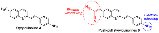 From the point of view of optical imaging purposes, we reasoned that the absorbance and emission maxima in styrylquinolines should be readily altered by incorporating a push-pull architecture, thereby strengthening the molecule’s electron-donating and -accepting properties to amplify the bathochromic shift in its spectrum. To this end, we designed the highly conjugated compounds 6, bearing electron-releasing dialkylamino groups and electron-withdrawing dicyanomethylene groups at the ends of the molecule (Figure 1).