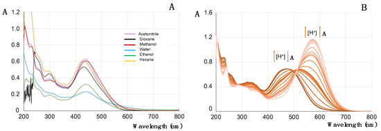 (A) UV-Vis absorption spectra of compound 6f at 1.0 × 10−5 M concentration in several solvents (A, absorbance). (B) Effect of increasing HCl concentration on the UV-Vis absorption spectra of compound 6f (5.0 × 10−5 M) in ethanol.