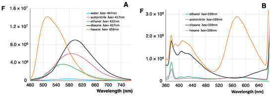 (A) Fluorescence emission spectra of compound 6e (λex = 420–450 nm) in solvents with varying polarity. (B) A similar study performed for 6h at λex = 339 nm. Concentrations: 2.5 × 10−7 M for hexane and dioxane; 1.0 × 10−6 M for acetonitrile and ethanol; 5.0 × 10−6 M for water. F: Fluorescence in arbitrary units.