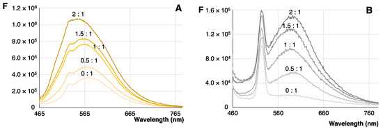 (A) Alterations in the fluorescence emission spectra of compound 6a (λex = 330–380 nm) in acetonitrile and in the presence of increasing amounts of HCl. (B) The same experiment, performed at λex = 460–550 nm. F: Fluorescence in arbitrary units.