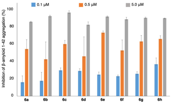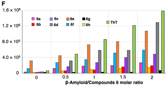 After confirming that compounds 6 interact with β-amyloid fibrils, their ability to inhibit Aβ1–42 aggregation was demonstrated by measuring the decrease that they cause in the fluorescence intensity of a positive control formed by Aβ1–42 fibrils with Thioflavin T (ThT). This effect was observed for all compounds tested at concentrations ranging from 0.1 to 5 μM. At the highest concentration (5 μM), all compounds reduced ThT fluorescence by up to 80%. The choice of ThT over other possible fluorescent dyes, such as Congo red or trans-2-[4-(dimethylamino)styryl]-3-ethyl-1,3-benzothiazolium perchlorate (DMASEBT) was based on its better aqueous solubility in comparison with the former and its ready commercial availability as regards the latter [63,64]. As shown in Figure 11, the most active compound at a 0.5 μM concentration, which is non-toxic for all compounds, is 6e, closely followed by the more rigid julolidine derivative 6g and the naphthalene derivative 6h.