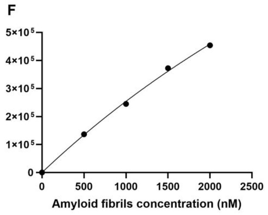 An example of dissociation constant determination, based on the variation (increase) of the fluorescence intensity (F) of compound 6c in the presence of increasing concentrations of fibrils of β-amyloid peptide; λex = 429 nm, λem = 540 nm.