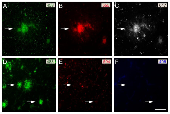 Compound 6b was chosen for an initial labeling study by assessing its binding properties in the somatosensory cortex of APP/PS1 transgenic mice, a model of Alzheimer’s disease that develops amyloid-beta deposits in the brain from 6 to 7 months of age. The results obtained demonstrated specific binding to β-sheet amyloid structures, as evidenced by detection at multiple excitation wavelengths (Figure 8). Amyloid-beta plaques were most distinctly labeled at an excitation wavelength of 458 nm, with effective staining also being observed at 488 nm and 555 nm (Figure 8A–D). In contrast, no staining was detected when exciting at 594 nm or 405 nm (Figure 8E,F).