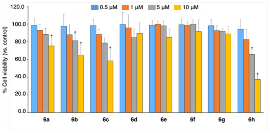 The stable HEK/tau cell line, which overexpresses wild-type human tau (4R1N) in HEK293 cells, displays a moderate level of tau phosphorylation. This phosphorylation can be further elevated by treatment with okadaic acid, leading to tau hyperphosphorylation and providing a relevant Alzheimer’s disease model linked to tau aggregation. The cytotoxic effects of compounds 6 were evaluated in HEK293-Tau3R cells, characterized by tau protein overexpression and which were used for subsequent neuroprotection studies, using the MTT assay. Compounds 6 were tested at concentrations ranging from 0.1 to 10 µM, and most exhibited cytotoxicity below 80% at 5 µM (Figure 10). It should be noted that HEK293-Tau3R cells are significantly more susceptible to compound-induced reductions in viability compared to more robust cell lines such as SH-SY5Y [62].