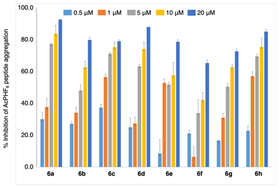 Effects of styrylquinolines 6 on AcPHF6 aggregation. Fibril formation was evaluated by measuring Thioflavin T (ThT) fluorescence in both the absence and presence of styrylquinolines, and the results are reported as the percentage inhibition of aggregation (mean ± SEM) for each styrylquinoline concentration, based on three independent experiments. All compounds, at all concentrations assayed, significantly inhibited tau hexapeptide aggregation (p < 0.05 versus 10 μM AcPHF6, using the Student–Newman–Keuls test).