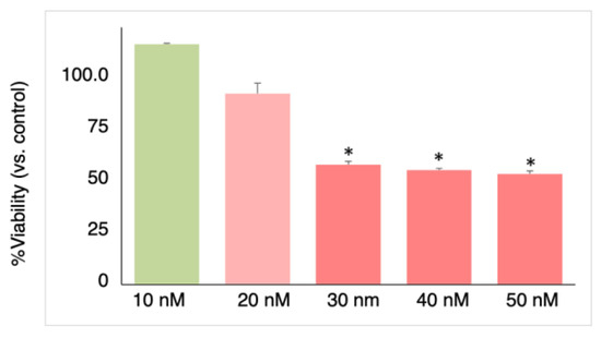 Effects of okadaic acid on cell viability at the concentration range of 10–50 nM. Data are expressed in percentage of control HEK293-Tau3R cells and represent the mean ± SEM of three independent experiments performed in triplicates. The symbol * indicates significant differences of okadaic acid treated cells versus non-treated control cells (p < 0.05) (Student–Newman–Keuls test).