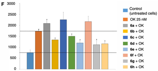 In this context, to determine whether cell death was mediated by apoptosis, we measured the levels of caspase 3, which plays a key role in both the intrinsic and extrinsic apoptotic pathways. When cells were treated with 10–50 nM concentrations of okadaic acid, an increase in caspase 3 activity was detected at concentrations up to 25 nM. Given that cell viability decreased up to a concentration of 30 nM okadaic acid, while caspase 3 activity began to rise starting from 25 nM, we selected a 25 nM concentration of okadaic acid to assess the neuroprotective effects of compounds 6 in HEK293-Tau3R cells. Our initial experiments were aimed at confirming that compounds 6 did not alter caspase 3 activity under normal conditions. Subsequently, cells were co-treated with 25 nM okadaic acid and compounds 6 at either 10 or 100 nM concentrations, and it was observed that 6b, 6d, 6e, 6g, and 6h significantly reduced caspase-3 activation induced by okadaic acid in HEK293-Tau3R cells. For example, treatment with a 100 nM concentration of compound 6g decreased caspase-3 activity by more than 50% compared to cells treated with okadaic acid alone (p < 0.05), with very similar results being found for 6e and 6h (Figure 14).